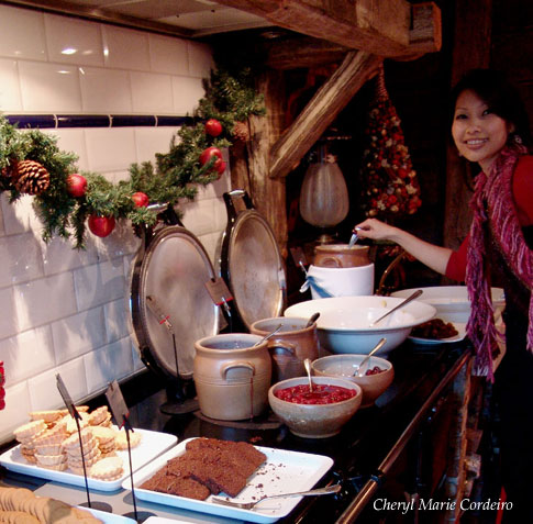 At the dessert table, with one hand on the whipped cream pot. The other pots along the buffet line contain a scrumptious array of home made jams – strawberries, raspberries, cherries and cloud berries. The last is a traditional northern Swedish berry that is rare and a difficult pick.