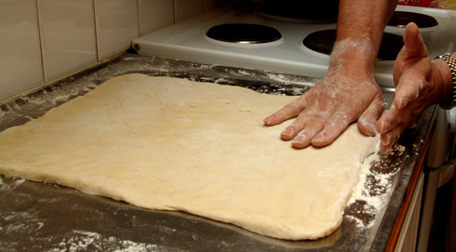 Cut the roll with a baking knife and put on a baking tin. If you follow this recipe, you’ll get about 25 rolls which gives 12 on each tin. The last you can eat yourself, raw, as JE does. I just cringe when he does that.