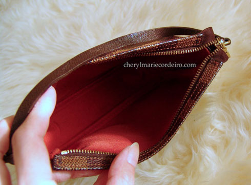 The inside of this bag is lined in Vuitton’s signature orange fabric that contrasts pleasantly with the deep chocolate exterior. It closes with a zipper at the top.