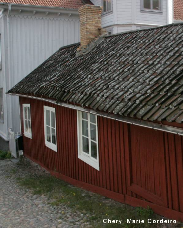 Still around from an era long before Marstrand turned into a posh summer resort is this house, built to house both a small family and their cow. Originally the roof was covered with grass. Eventually the house has slid into a more comfy position over the centuries and the glass panes needed to be custom fit for the now no longer square window frames.