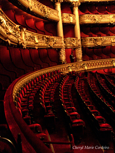 On the ceiling of the auditorium hangs a bronze and glass chandelier designed by Charles Garnier with 340 lights. A massive piece of art.
