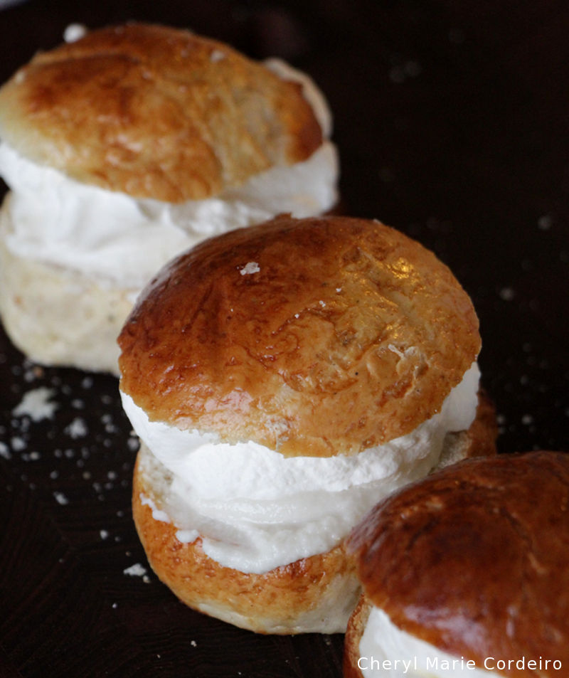 A Swedish semla, a creamy marzipan filled cardamom bun, topped with…more cream.