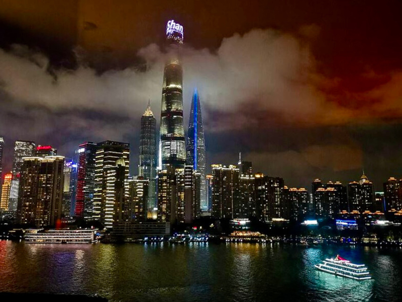 I found a spot along the railing and just watched the river traffic for a few minutes. Illuminated cruise boats, cargo vessels, the occasional speedboat cutting white lines through dark water. Across the river, the Oriental Pearl Tower’s colored lights cycled through their programmed sequence while the Shanghai Tower, China’s tallest building, pierced the night sky like an exclamation point on the city’s ambitions.